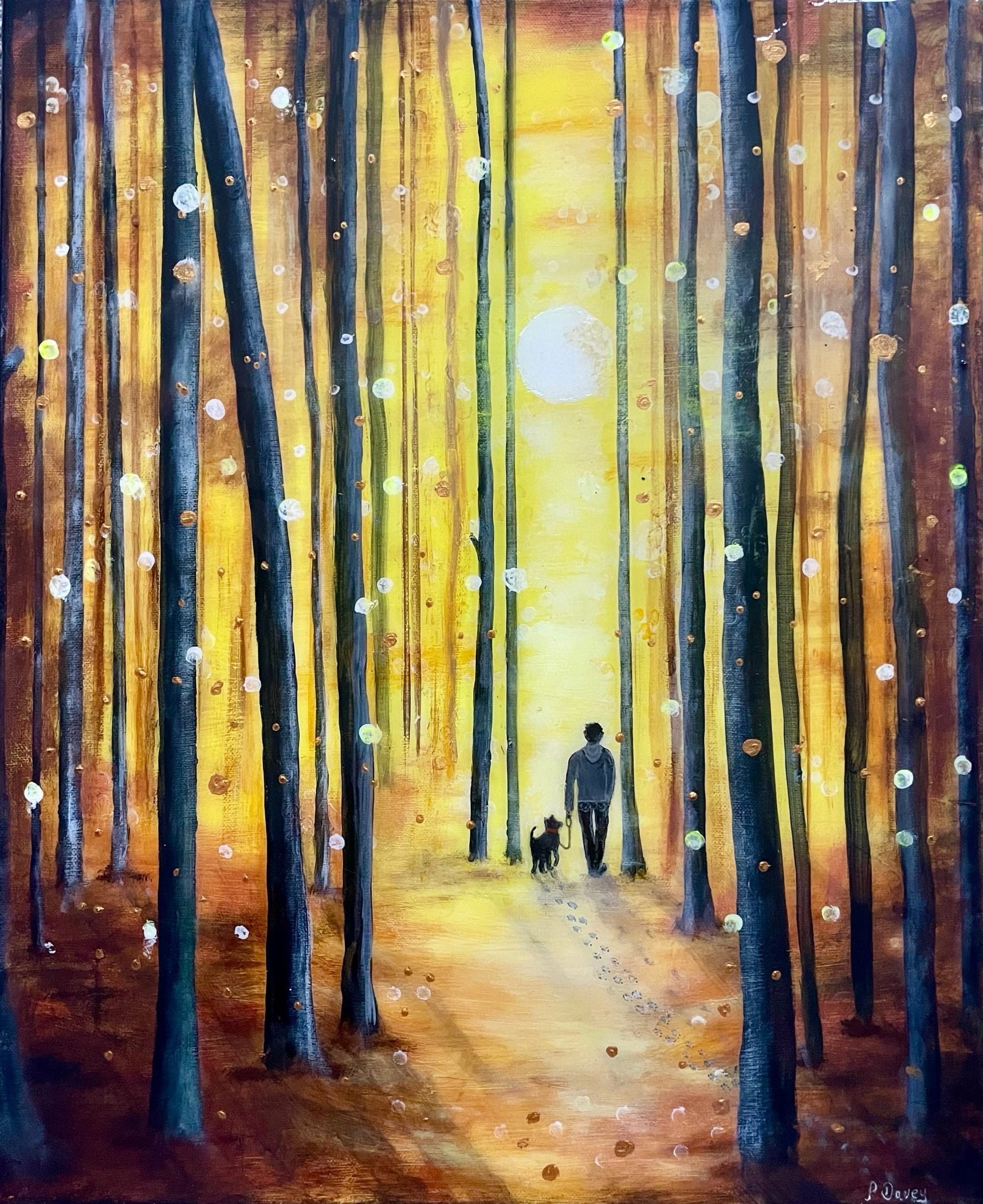 I have just received "Into the sun", what a beautiful painting. Reminds me so much of my beautiful girl Layla, early morning walk in Asham Wood walking out "into the sun". thank you